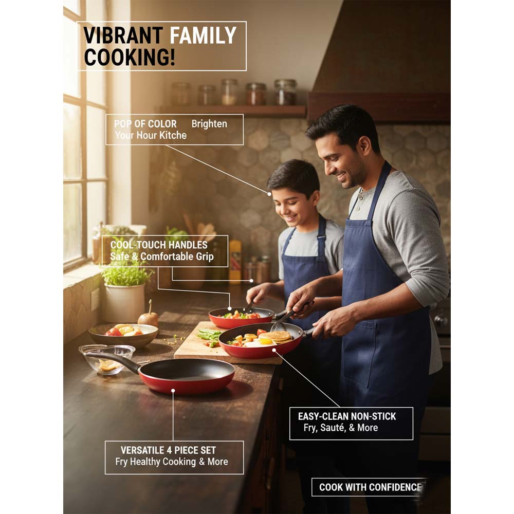 The OE-017 4-Piece Non-Stick Frying Pan Set in a vibrant red finish combines exceptional kitchen functionality with a bold and stylish aesthetic. This comprehensive set is designed to handle all your cooking needs, featuring three durable frying pans in practical sizes—typically 20 cm, 24 cm, and 26 cm—allowing you to effortlessly prepare multiple dishes at once or select the ideal pan for any recipe, from a small side dish to a large main course. Each pan is crafted with a robust aluminum body that ensures rapid and even heat distribution for consistent cooking results without hot spots. The high-quality non-stick interior coating guarantees easy food release, promotes healthier low-oil cooking, and makes cleanup remarkably straightforward. The set is completed with a matching red nylon spatula that is gentle on the non-stick surfaces, preventing scratches while you cook.For the ultimate convenience in a busy kitchen, these pans are dishwasher-safe, allowing for quick and effortless cleaning after meals. The ergonomic handles are designed to remain cool to the touch during use and provide a secure, comfortable grip. The striking red color adds a cheerful and modern pop of color to your kitchen decor. Combining versatile sizing, durable performance, and a stylish design, the OE-017 set is a perfect blend of form and function for home cooks who value both efficiency and visual appeal.Products 7 Bullet Point:Complete 4-piece set includes three red frying pans and a matching nylon spatula.Pans available in complementary sizes (20cm, 24cm, 26cm) for versatile cooking.Strong aluminum construction provides fast, even heating for perfect results.Effective non-stick coating ensures easy food release and simple cleaning.Dishwasher-safe design for effortless cleanup after use.Ergonomically designed handles stay cool and offer a secure, comfortable hold.A vibrant and functional cookware set that adds style to any kitchen.10 Products Keyword:Red Non-Stick Frying Pan Set4 Piece Cookware SetRed Aluminum Frying PansDishwasher Safe Pan SetOE-017 Red Pan SetColorful CookwareMulti-Size Frying PansNon-Scratch Nylon SpatulaEven Heat DistributionStylish Kitchen Set